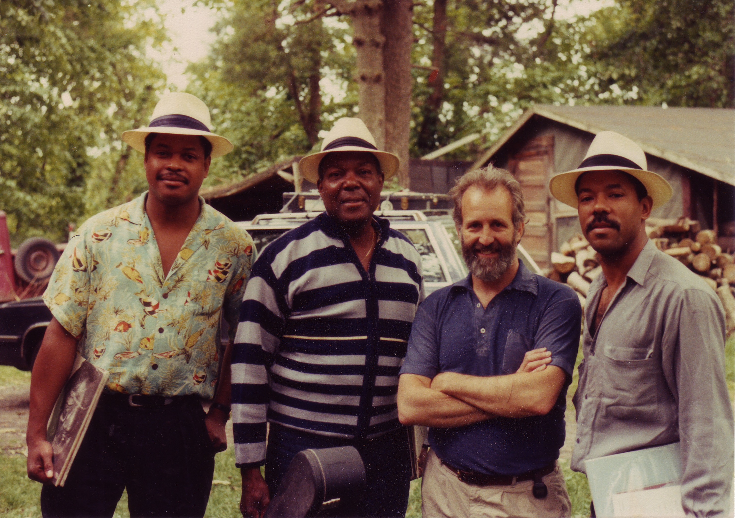 We left the US in 1995, so this was taken at my house there beforehand – John has one of my Nationals (on loan), and Phil and Michael have sample Trix LPs. This was before 1988, in all likelihood, taken when John and Phil had played a gig at The DuPuis Canal House nearby and they came on up for breakfast – pancakes, no doubt! Michael was their driver and was learning guitar from Cephas.