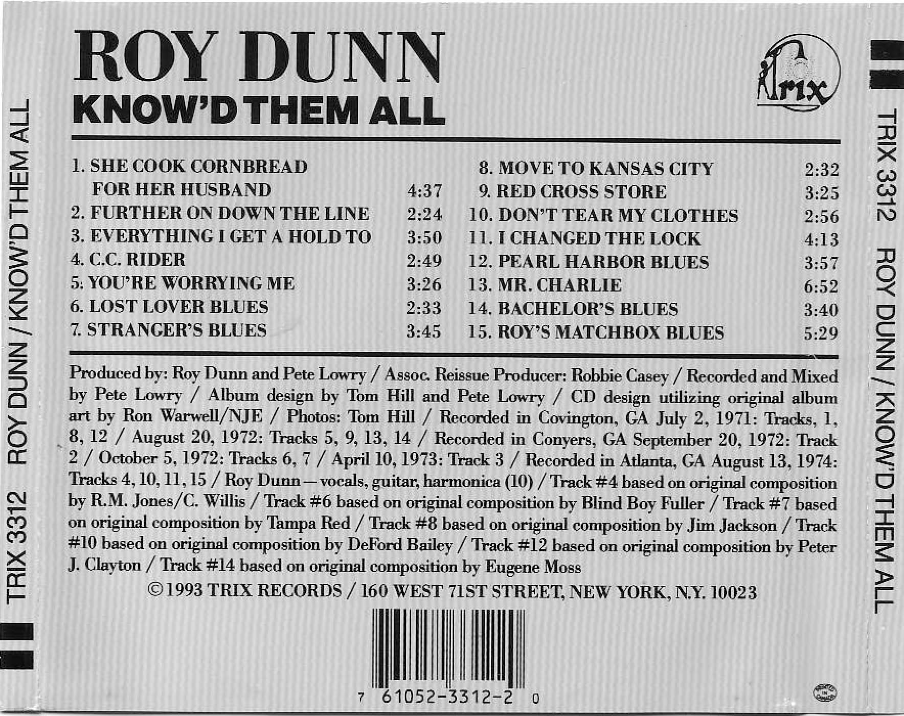 Atlanta, Georgia was always a major blues center, starting with Barbecue Bob or Peg Leg Howell in the ’20s, on to Curley Weaver, Blind Willie McTe|l, or Buddy Moss in the ’30s. Since then, blues musicians have continued to exist in the city, though the recording industry has mostly passed the area by (Billy Wright, and one or two others being the exceptions). The local country blues artists of the earlier era are remembered even today by the many unrecorded musicians in the city, as are a few others from outside the state (such as Blind Blake, Blind Boy Fuller, and Lightnin’ Hopkins). One of the artists around Atlanta today is Roy Sidney Dunn, born April 13, 1922 in Eatonton, GA, a town in Putnam County, one of twelve children of Willie and Estelle Dunn. He moved to Kelly in Jasper County when near the age of nine – there he started messing around with the guitar, being first taught by one Jim Smith (the tunes being the expected “John Henry”, and later on “Move To Kansas City”). A later move to Covington put Roy in contact with Curley Weaver and Jonas Brown – it was the former that taught him to tune a guitar himself – who played at times then with fiddle-player Ollie Griffin and guitarist Cliff Lee. This was about 1935, and he stayed around Curley until 1938, when he left Newton Co. Music was definitely a part of the rather large Dunn family, and among the relatives so inclined were uncles Simon (gtr), Jerry (gtr, hca, pno, sax), Oscar (hca), and Steve (gtr), as well as his father and a few of his aunts. There definitely was some music around. Through the influence of his choir-leading father, a singing group was formed from the family, logically called the Dunn Brothers and made up of Roy, Fred, Oscar, and Edward. Quartet singing was to play an important part in Roy’s musical life, and its influence can be heard today in his excellent singing. On top of all this, there was the influence of the ubiquitous phonograph record – Blind Blake, Jimmie Rogers, Barbecue Bob, Blind Lemon Jefferson, Buddy Buy Hawkins, Willie Walker, and Lonnie Johnson are all older names well-remembered. More recently, the influences were the many Atlanta artists he heard, as well as records from Blind Boy Fuller, and Lightnln’ Hopkins. For some ten years, Roy traveled through the southern states, going into Alabama and Tennessee, and some further west – Atlanta was just a stopping-off place for these years. Much of the time on the road was with quartets, either traveling with a particular group or joining one in an area . . . among them were the All National Independents, the Victory Bond Spiritual Singers, the Rainbow Gospel Four (these two on guitar only), the Galilee Four, the Keystone Four, and the Golden Gospel Singers. When in Atlanta, he played often with Blind Willie McTell, Curley Weaver, or Buddy Moss (of the known artists) and he claims to have seen Blind Boy Fuller one time in the Atlanta area, a possibility pointed to by others. Among the “unknowns” that Roy has known or played with over the years are Paul McGuiness, Bunny Tiller, Glenn Gates (known as “Baltimore” and a cousin of the Rev.), Eddie Lee Johnson, Connie Jackson, Link Paul, “Bo Weavil”, “Popcorn”, William Jolly, Buddy Keith, R.W. Lawson, and Edward “Chicken” Knowles. One of the major talents of the man is not only his recall of the names of musicians, but also when and where he saw them last and often what kind of car they were driving! Rather an Atlanta encyclopedia with two legs. Roy settled back into the Atlanta area again about the time of the Korean War, staying with his parents who ran a cafe on the corner of Butler and Decatur Sts. He was there when Buddy Moss got back into town, but it was not too long afterwards that he [Roy] got into trouble and spent four years in jail for manslaughter, where he was made a trustee. In jail, he worked on his guitar technique, and also learned how to drive heavy equipment – this latter being useful after his release in 1960. Prior to this, he had been a peripatetic jack-of-all-trades, but now he was able to get steady work on the machines building highways through the central part of the state. Running the big stuff was the main thing, with music a weekend affair, until Christmas of I968 when a white lady plowed into the driver’s side of Roy’s car. He suffered a broken back, arms, collarbones, right leg and foot, and a skull fracture; his wife Myrtis had her jaw broken and her teeth knocked out, and their baby was killed. It took him a good year to recover from the damages, and since that time he and his wife (and four new children) have been subsisting on state disability payments and whatever else he can scrape from what light work that he can handle. Weak-limbed from all this, Roy has not been able to go back to construction work, though he has been able to play the guitar again – he still gets out to entertain his friends, often with some of these songs. Roy Dunn is an eclectic artist, a writer of a couple of good songs, a nice player of the guitar, and a marvelous singer. All his many influences show on this album, so give it a listen. —————————————————————————————————————————————– SHE COOK CORNBREAD FOR HER HUSBAND – “And biscuits for her backdoor man”, to complete the phrase. A fine song about an unfaithful woman. (1) FURTHER ON DOWN THE LINE – Sort of an answer to the above tune. Note the percussive effects that Roy pulls on the guitar face. (3) EVERYTHING I GET AHOLD TO – This is sort of an auto-biographical protest song; you feel he means it. (5) C.C. RIDER – The classic song from the twenties, probably pushed through fellow Atlantan Chuck Willis’ hit of the fifties. (6) YOU’RE WORRYING ME – A Hopkins-like tale of that woman again. Giving further support to the chauvinism of blues! (2) LOST LOVER BLUES – A song from the B